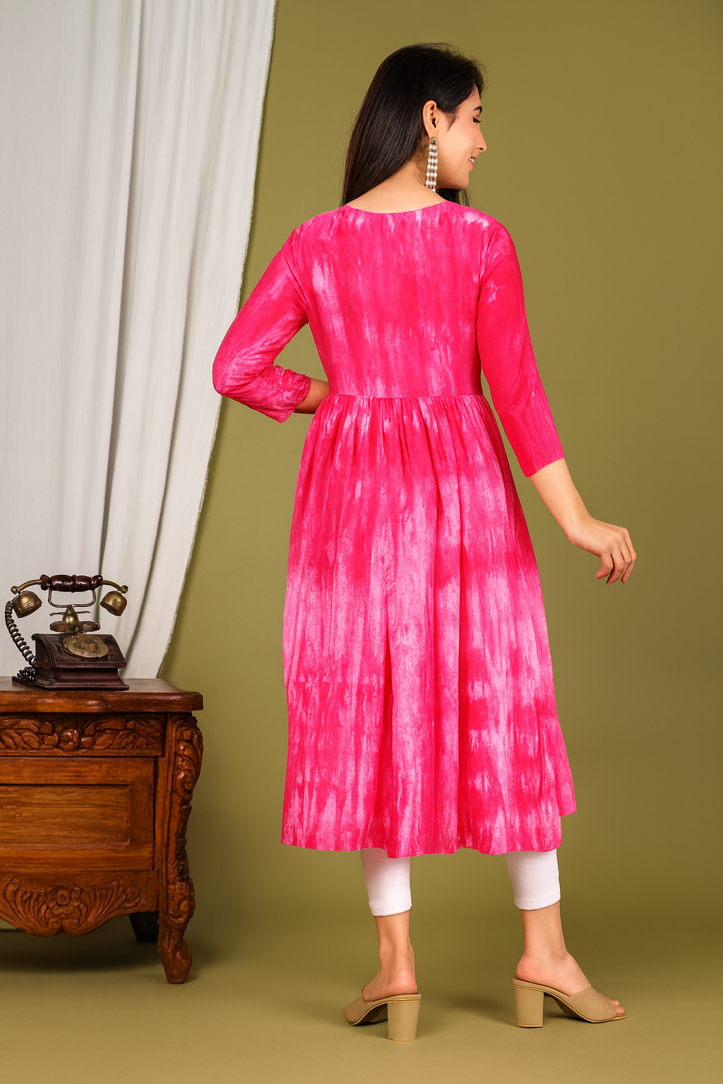 This elegant Anarkali kurti is crafted from soft & breathable rayon, giving you all-day comfort. The beautiful tie & dye washed pattern, flared fit, and 3/4th sleeves make it perfect for casual outings, kitty parties or daily wear. Pair it with leggings, palazzos or cigarette pants for a complete stylish look! ✨